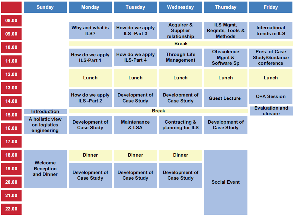 Kursen berör internationella standarder och initiativ, inklusive PLCS (Product Life Cycle Support), och belyser samspelet mellan upphandlare och leverantör. Den kombinerar teori och praktiska moment och avslutas med en simulerad ILS-konferens.